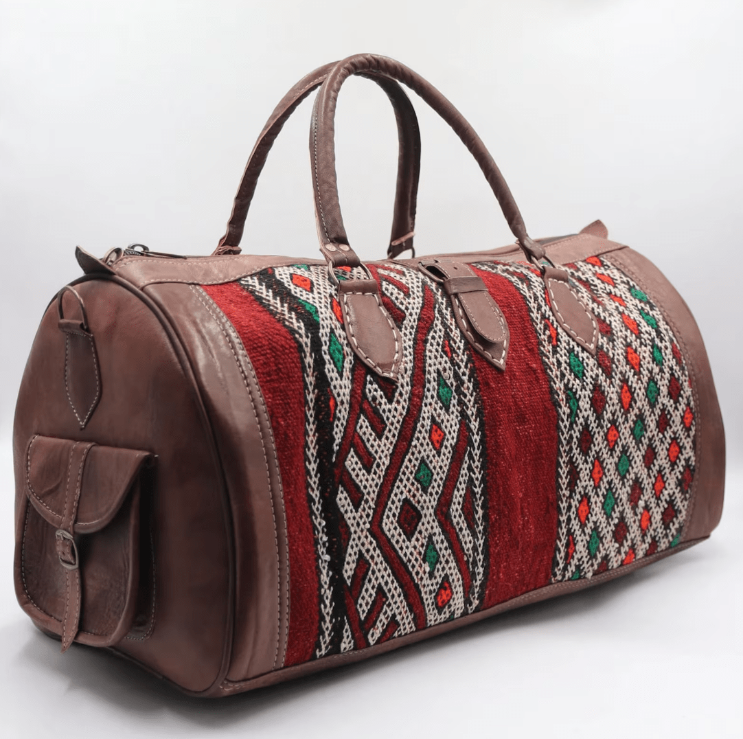 Reisetaschen aus echtem Naturleder und klassisch gewebten Berber Teppich einzigartig im Design. Unsere Reisetaschen sind handgefertigt mit einem hochwertigen Finish im Boho look sowie einer ausziehbaren Öffnung von Ende zu Ende, die Vielseitigkeit und einfachen Zugang bietet. Der Weekender wurde in Marokko handgefertigt und besteht aus Ziegenleder, welches zu 100% ohne Chemikalien verarbeitet wurde. Er ist in den Farben dunkelbraun und hellbraun erhältlich.